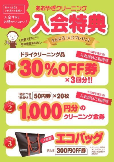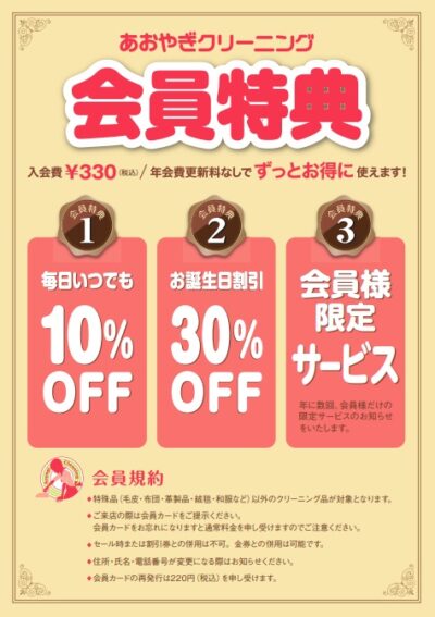 あおやぎクリーニングでは会員さま限定の特典をご用意しております。当店をご利用されるのであれば、ぜひ登録をご検討ください。